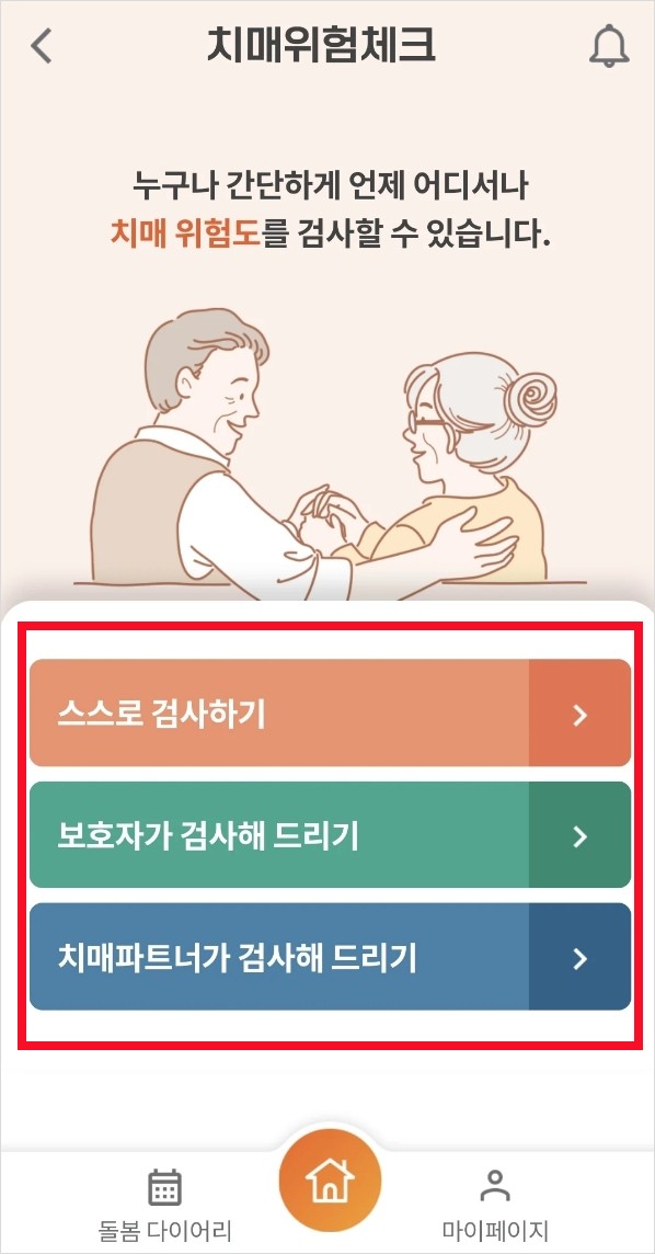 보건복지부에서 운영하는 치매체크 앱을 이용하시면 간단하게 치매진단테스트를 이용할 수 있습니다. 회원가입없이도 간편하게 테스트 및 치매예방에 도움을 받을 수 있습니다.